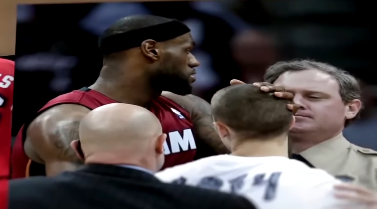 The fan was dressed in a white T-shirt with “We miss you” on the front and “come back in 2014” on the back. Like that football fan, this basketball fan named James Blair also embraced his idol, james also patted his head to show encouragement.