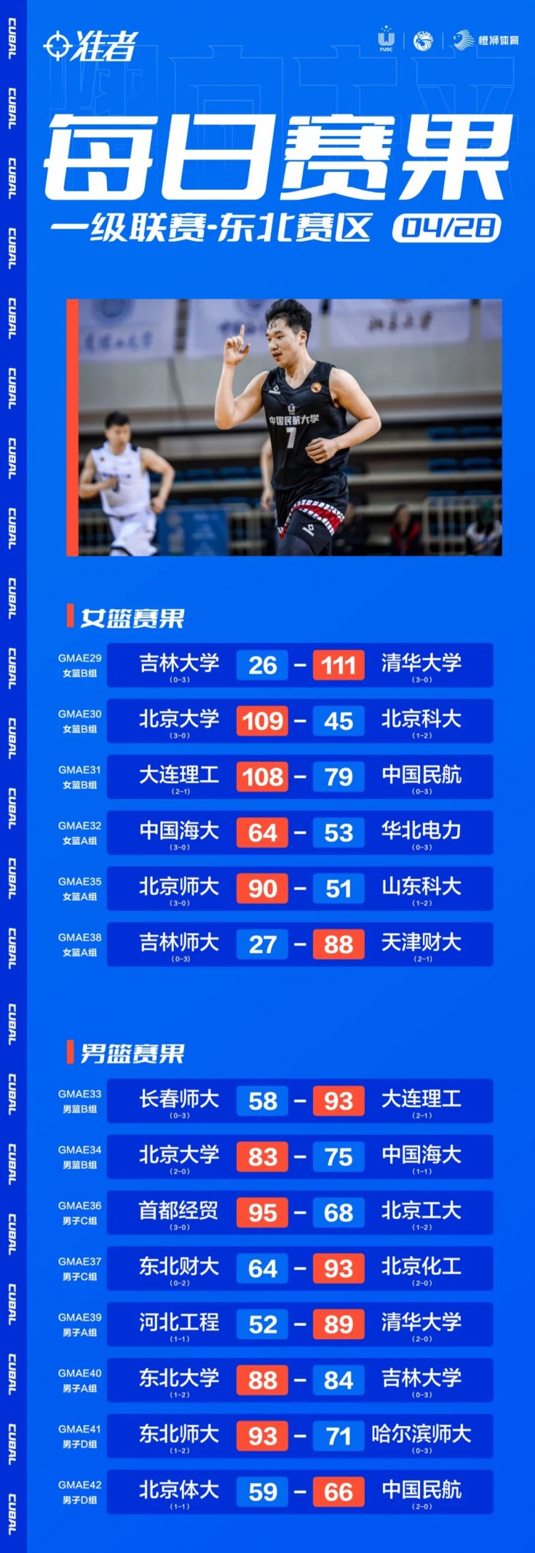 On April 28, the Northeast Division entered the third competition day. In women’s basketball, China Haida, Beijing Normal University, Tsinghua University and Peking University continued to win in a row. In terms of men’s basketball, Group A Tsinghua University won two consecutive victories, Group B Peking University Leck China sea University won the second victory, Group C ranked the first economic and trade, Beijing Chemical industry continued to maintain an undefeated record, and A strong duel will be launched tomorrow! Group D China civil aviation successfully attacked the North University and won a winning streak; Northeastern University defeated Jilin University! Tomorrow’s focus battle, the first economic and trade against Beijing Chemical Industry, North Sports University against China Stone University!