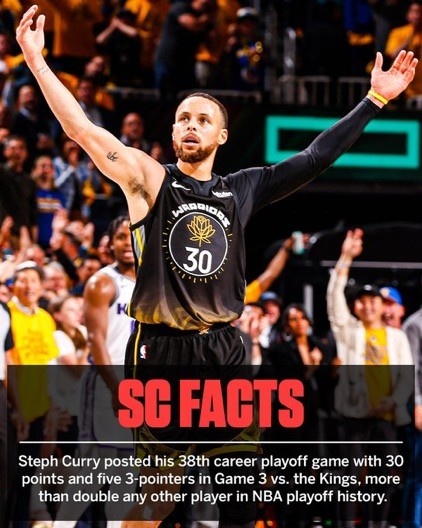 According to statistics, this is the 38th time Curry’s career has cut 30 + and scored 5+3 points in the playoffs. The NBA history is the first, and the second is Harden’s 17 times. The first five are as follows: