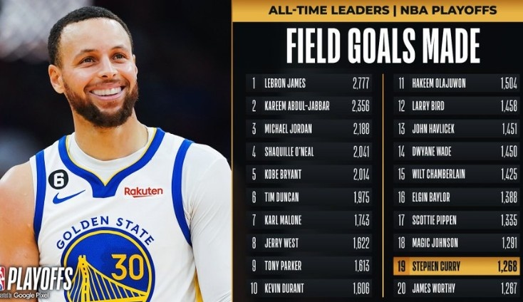 At present, Curry 9 scored 10 points, 1 assist and 1 steal, and his playoff goals came to 1268 (1265 before the game), surpassing the Lakers’ ranking James wosi and rising to the 19th in NBA history.