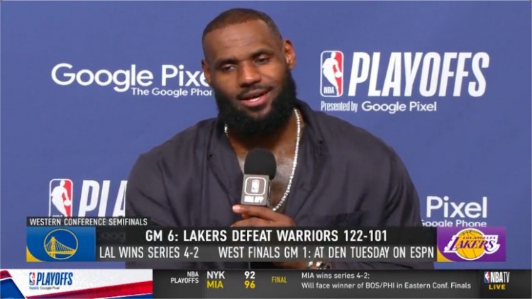 Live Bar, May 13 news the Lakers won the Warriors 122-101 today, with a big score of 4-2 to advance to the Western finals. After the game, Lakers star James was interviewed by the media.