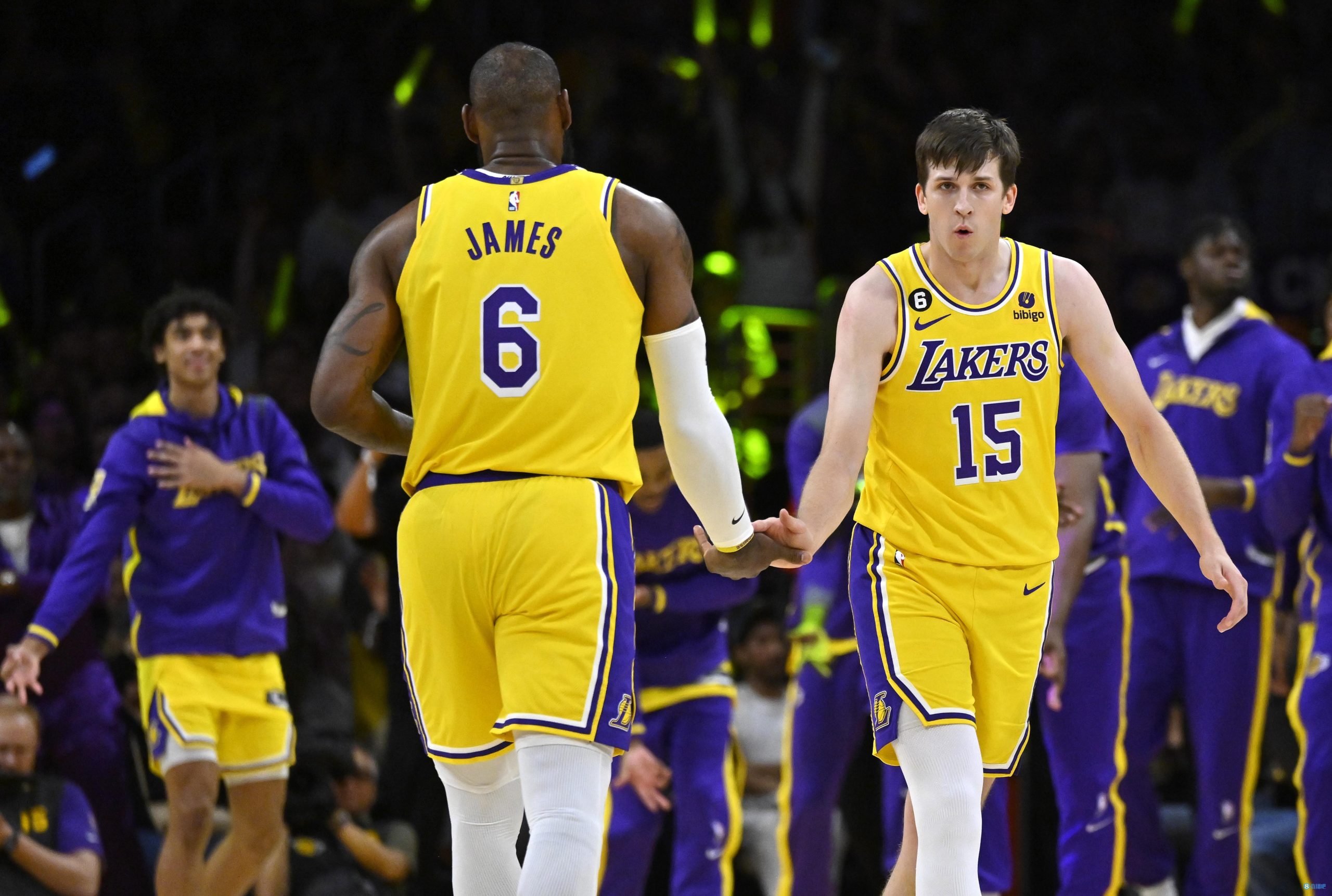 Lakers starting: Vanderbilt, James, heavy eyebrows, Reeves, Russell.