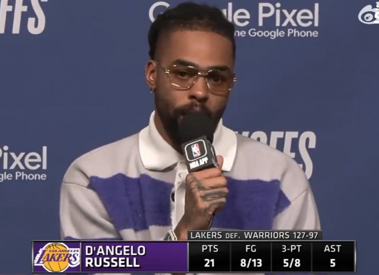 Live broadcast, May 7-The Lakers won the Warriors 127-97 at home today, leading 2-1 in the series. Russell was interviewed by the media after the game.