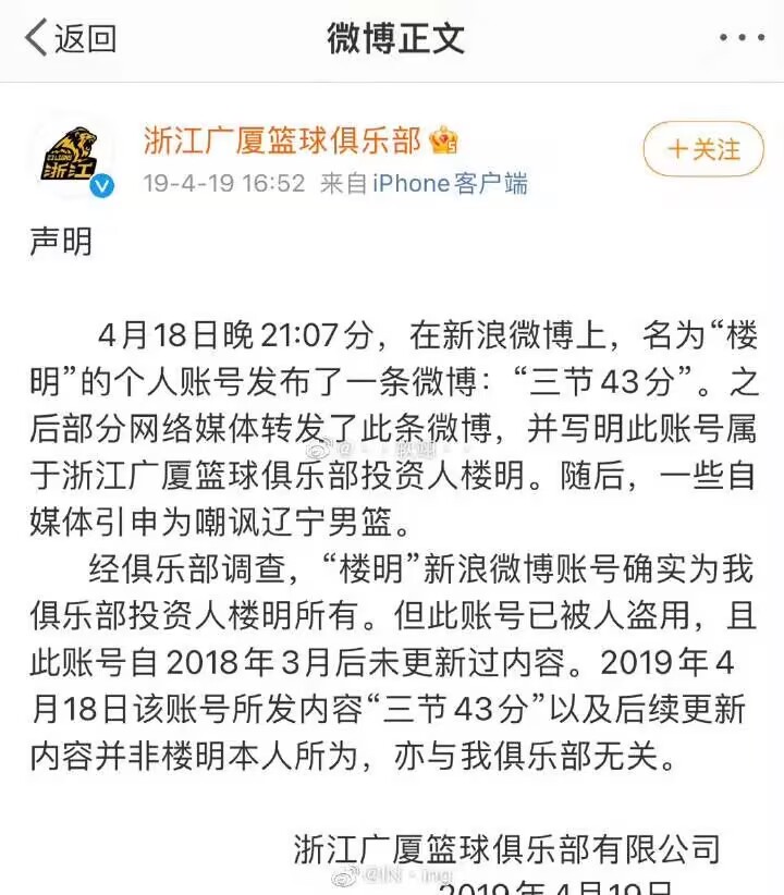 It is worth mentioning that Lou Ming released a microblog with “three sections and 43 points” on April 18, 2019, which was extended to the media as a mocking Liao basket. However, Guangsha officially declared that this microblog was not sent by Lou Ming himself. The account had been stolen by others and had nothing to do with the club.