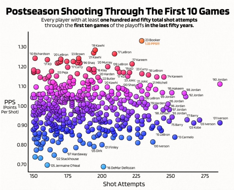 According to statistics, in the first 10 games of this year’s playoffs, Booker can score an average of 1.33 points per shot (PPS, shooting score), ranking first among all players in NBA in nearly 50 years.