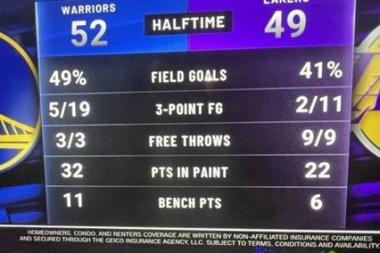 Half-time penalty area scoring Warriors 32-22 Lakers free throw shot Warriors 3-9 Lakers