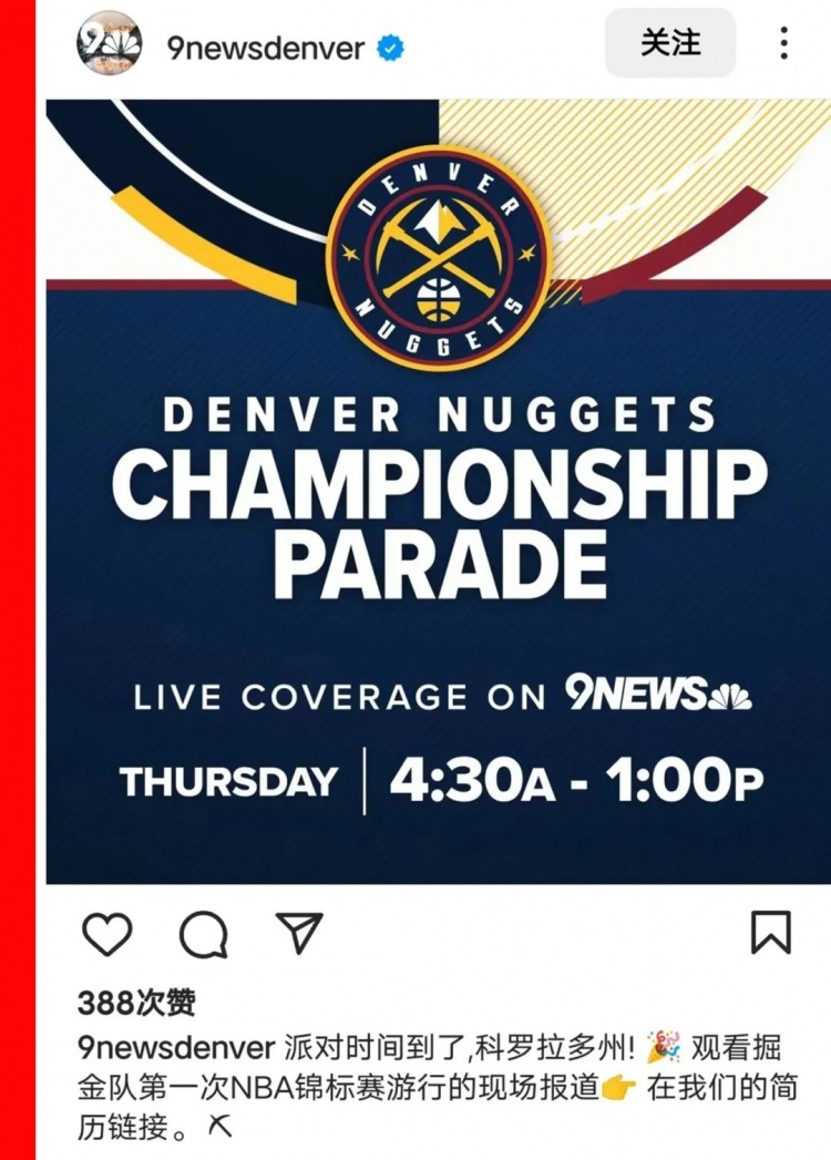北京时间今天凌晨,也就是丹佛时间昨天上午10点,掘金队在城里进行了庆功大游行,游行之后有一个视频在网上流传,掘金队员乘坐的消防车穿城而过,但街道两边观者寥寥,几乎没有什么人。