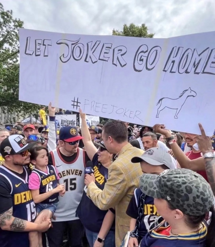 于是有球迷戏谑举标语牌,要求“释放约基奇回家”。