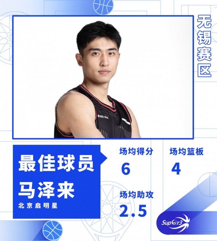 Ma zailai from Beijing QMX was selected as the best player in the super three satellite competition (Wuxi division). Ma zailai played 4 games in total, each of which could contribute 6 points, 4 boards and 2.5 assists, helping the team to end the Wuxi division with a record of 5 wins and 1 loss.