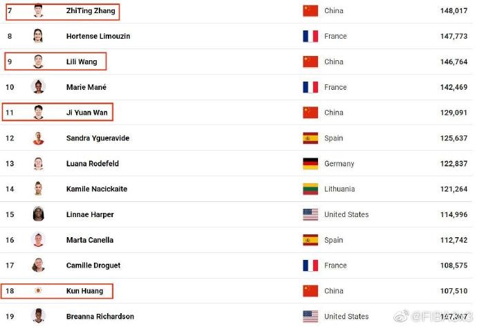 The Wanji yuan of the Chinese team has risen one place. Currently, it ranks 11th in the world, and Huang Di has risen five places. Currently, it ranks 18th in the world. Zhang Zhiting and Wang Lili rank 7th and 9th in the world respectively!