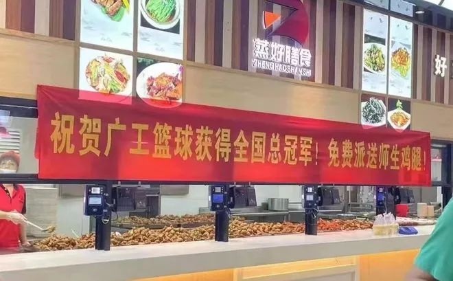 According to the pictures shared by Guanggong students on social media, the dining hall has already pulled up at noon, “Congratulations to Guanggong basketball for winning the national championship! Free congratulations banner for sending teachers and students chicken legs. In the window of cooking, chicken legs are also ready.