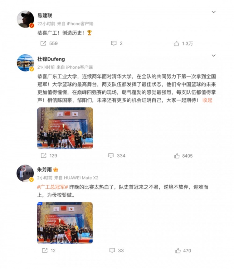 Guanggong basketball not only achieved a great record in the whole country, but also sent a large number of basketball talents to CBA. Professional basketball players from guanggong, including yi jianlian, du feng, zhu fangyu, zhou peng, su wei, dong hanlin, hong-fei shi, ren junfei, ren junwei, li yuanyu, ju Mingxin and Zhu Xuhang, etc. After Guanggong won the Cup, these “well-known alumni” also posted articles on social media to congratulate their alma mater on winning the championship.