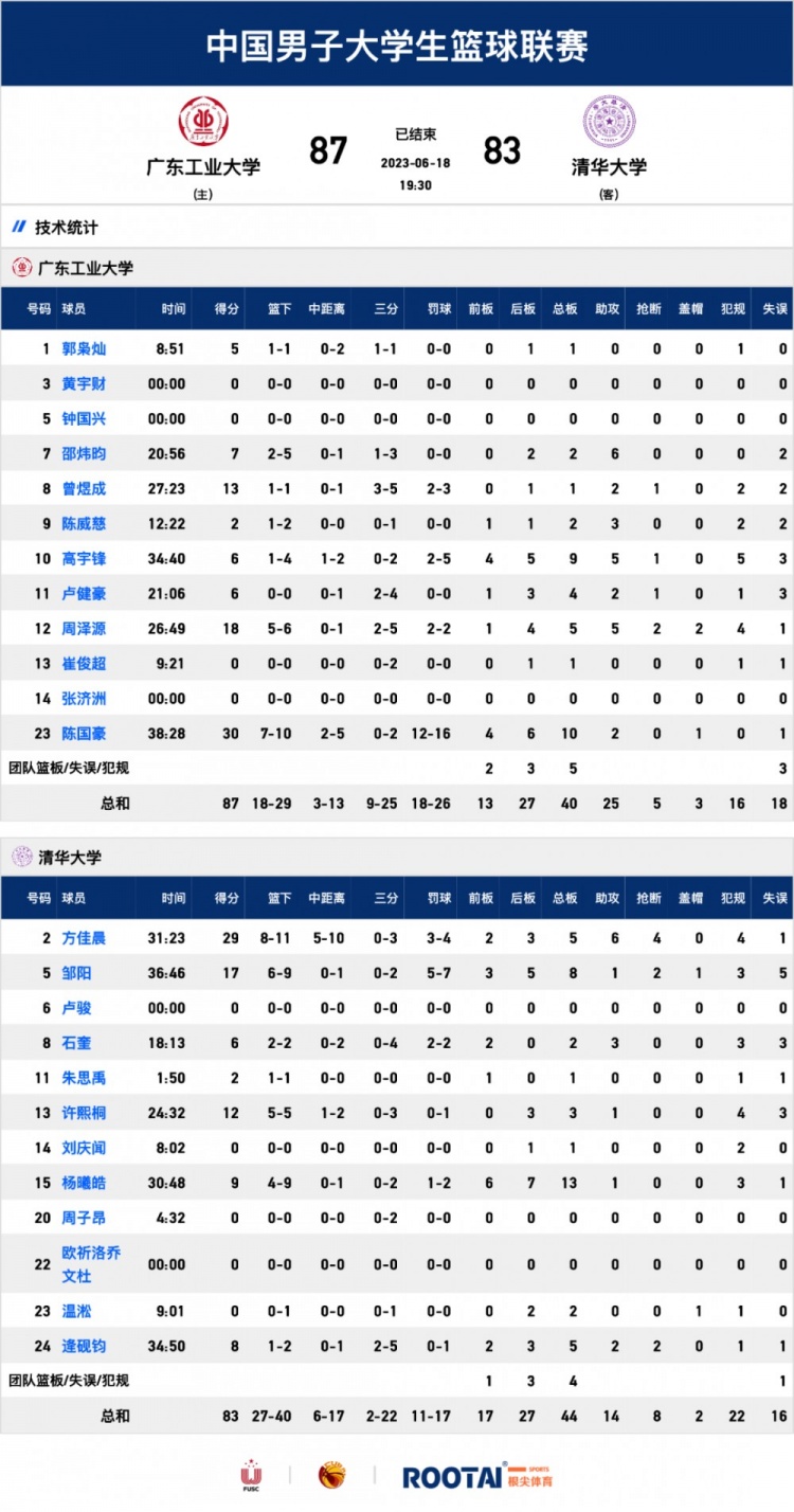 In terms of data, Guangdong University of Technology Chen Guohao scored 30 points, 10 rebounds, 2 assists, Zhou Zeyuan scored 18 points, 5 rebounds, 5 assists, 2 steals, 2 cap, Zeng Yicheng scored 13 points, 2 assists, and Gao Yufeng scored 6 points, 9 rebounds, 5 assists; fang Jiachen, Tsinghua University, scored 29 points, 5 rebounds, 6 assists, 4 steals, Zou Yang scored 17 points and 8 rebounds, 2 steals, Yang Xihao scored 9 points and 13 rebounds, Xu Xitong scored 12 points and 3 rebounds.