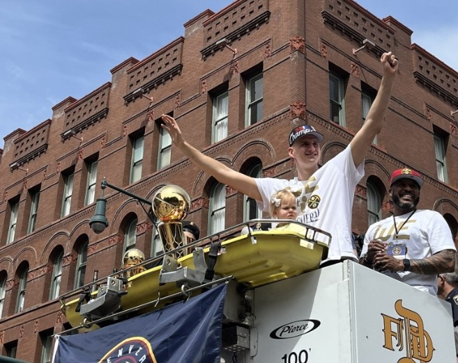 Jokic stood at the front of the parade vehicle with his daughter and Murray today, with the Championship and FMVP trophy in front of them.