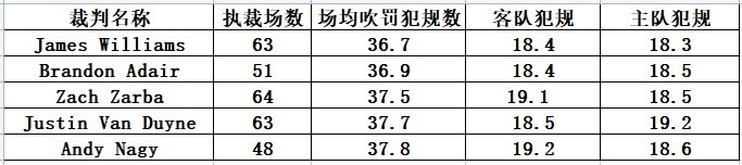 James Williams was the referee with the least penalty in each court. In 63 competitions in which he participated in the ruling, the referee Group sent 36.7 fouls in each court, including 18.4 fouls in the visiting team, the home team fouled 18.3 times.