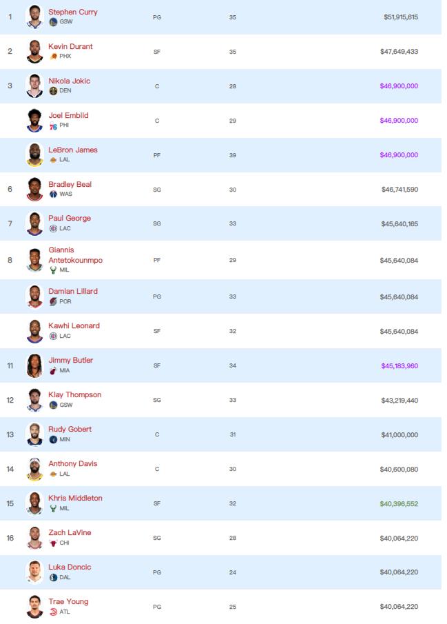 According to statistics, the annual salary of 18 players will exceed 40 million, of which Curry broke through 50 million (51.92 million).