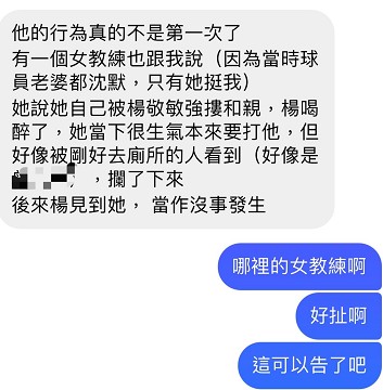 The media also said that last year, it was reported that the ex-wife of an active player posted a series of dialogue screenshots of the messages sent by Yang Jingmin in LINE (an APP similar to WeChat) in March 2020, the dialogue intention in the screenshot was fascinating: “When Yang Jingmin asked me out at that time, I also had a wife who was just like a player asking for help, expressing distress. They all chose to be silent, because their husband wanted to join the league, no one wanted to offend him. I was very angry at that time”.