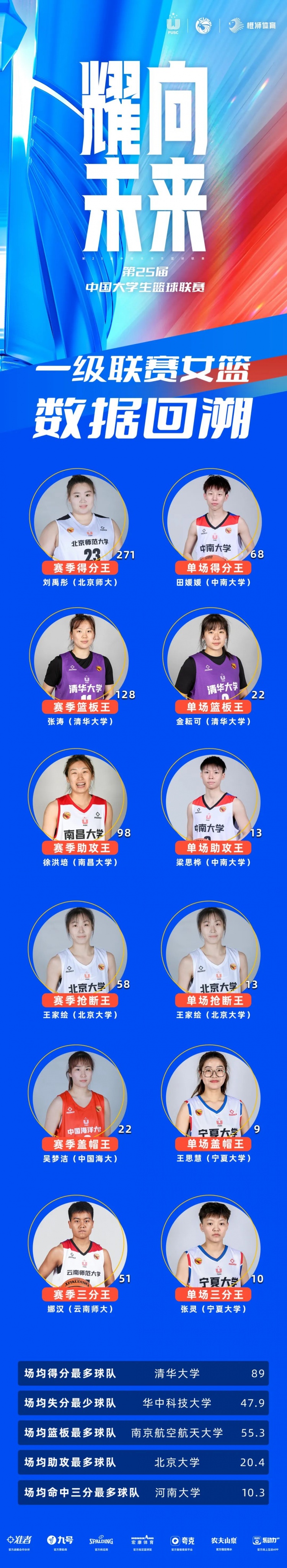 In terms of data on women’s basketball, Liu Yutong, Beijing Normal University, picked the season winner! Zhang Tao of Tsinghua University won the rebounder of the season, Xu Hongpei of Nanchang University won the champion of the season, Wang Jiayu of Peking University won the champion of the season, Wu Mengjie of China Haida won the blocked shots of the season, and Na Han of Yunnan Normal University won the three-point King of the season.