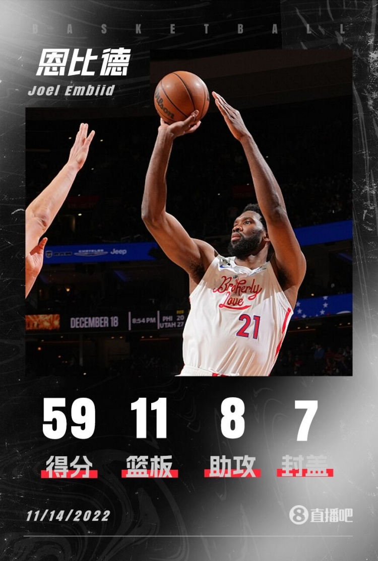 On November 14, 2022, the NBA regular season 76ers home court 105-98 Rick jazz. In this campaign, enbide ruled the inside of the Jazz. In the 28th Middle of the game, 19 (1 in the 5th third), 20 in the 24th free throw, and scored a career high of 59 points, at the same time, there are 11 rebounds, 8 assists and 7 caps (the highest in a flat career).