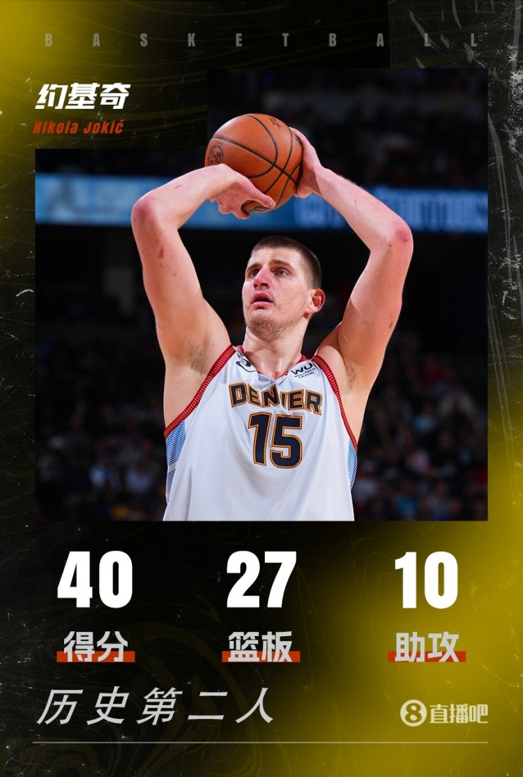 On December 19, 2022, in the NBA regular season Nuggets home 119-115 Rek Hornet game, yokki scored 13 in 26 shots, 2 in 4 in 3, 12 in 17 in free throws, and scored 40 points, 27 rebounds, 10 assists and 2 steals, field goal percentage 50%.