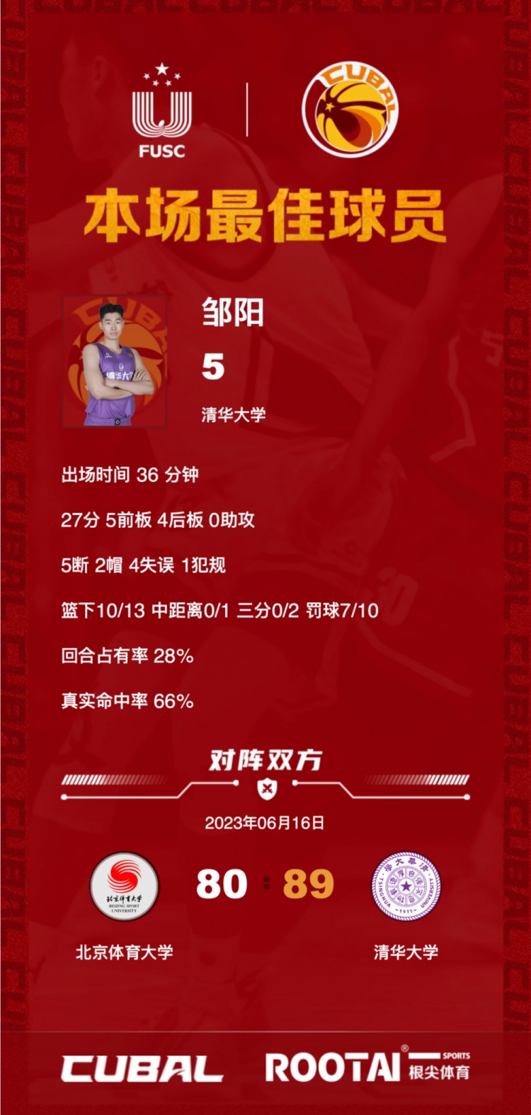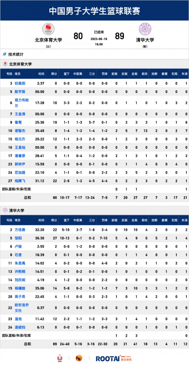 In terms of data, Tsinghua University zouyang 27 points 9 rebounds 5 steals 2 cap, Fang Jiachen 22 points 10 rebounds 4 assists 2 steals, Yang Xihao 14 points 10 rebounds 3 assists 3 steals; xie Zhijie, Beijing Sports University, scored 8 points, 7 rebounds, 13 assists, 2 steals, Yang Tengfei, 22 points, 2 rebounds, 3 assists, and Lu Yan, 19 points, 3 rebounds, 3 assists.