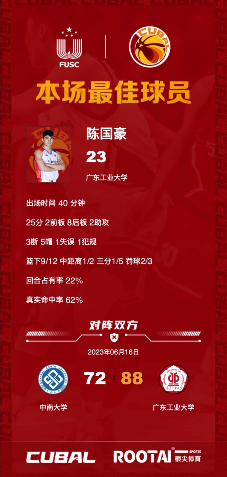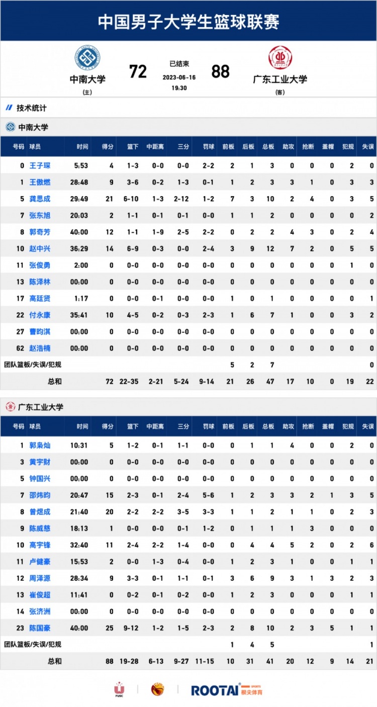 In terms of data, Chen Guohao, Guangdong University of Technology, scored 25 points, 10 rebounds, 2 assists, 3 steals, 5 cap points, 20 points, 2 rebounds, 15 points, 3 rebounds, 3 assists, 2 steals, gao Yufeng 11 points 4 rebounds 5 assists 2 steals; Central South University Gong Sicheng 21 points 10 rebounds 2 Assists 4 steals, Zhao Zhongxing 12 points 12 rebounds 7 assists 2 steals, guo Qifang scored 12 points, 2 rebounds, 4 assists, 3 steals, and Fu Yongkang scored 10 points and 7 rebounds.