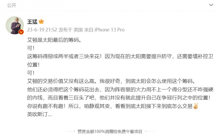 Wang Meng wrote on his personal microblog: “Elton is the last chip of the sun. OK! This chip has to be split into two halves or three pieces to spend! Because now the Sun needs to improve the defense, and it also needs to fill the position of the control guard!