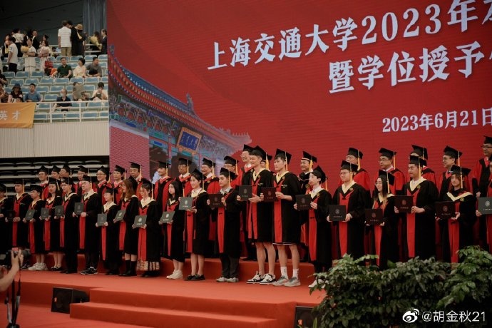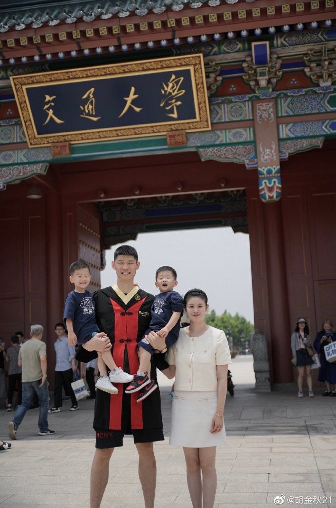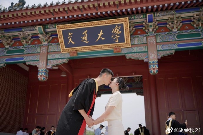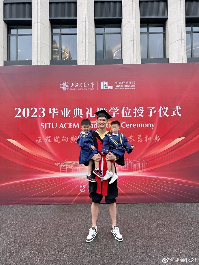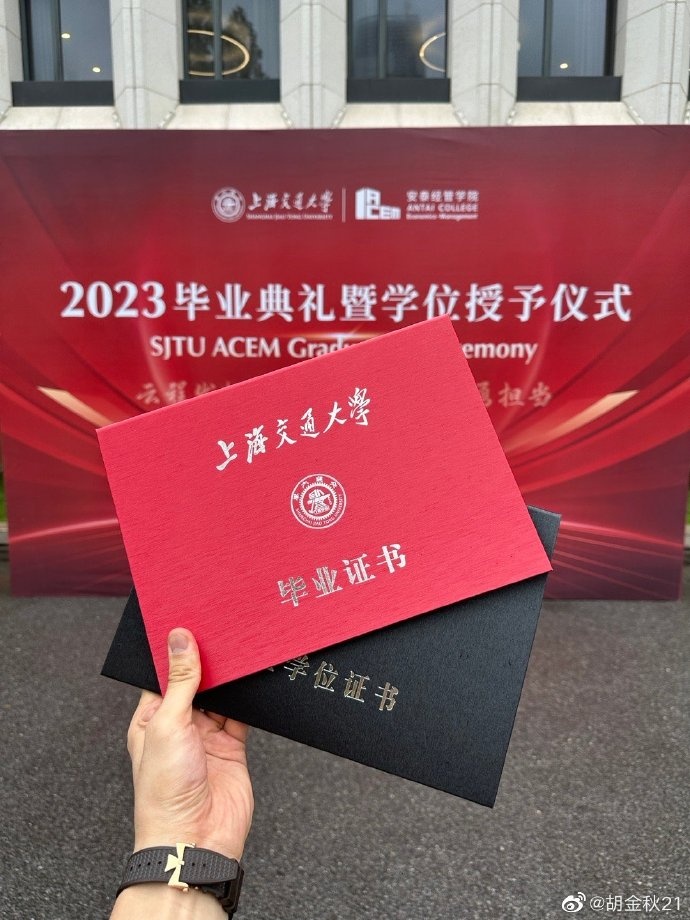 In the photo, Hu Jinqiu wore graduation dress and attended the graduation ceremony of Shanghai Jiaotong University with his wife and children. The accompanying article wrote: “Happy Graduation”
