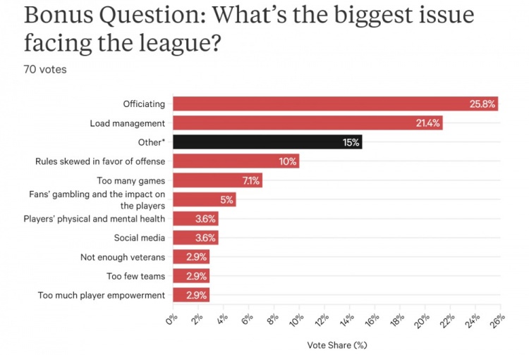 “其他”包括:新劳资协议、娱乐性大于竞争性、最佳阵容的最低出场数限制、过分强调三分投射、球员薪资、赛程安排的质量、球星和普通球员不平等的罚款程序、联盟的快速发展、太多年轻球员和摆烂