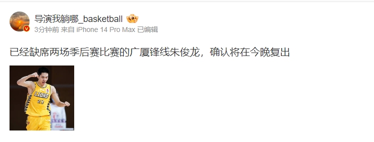 Live broadcast bar, April 23, according to media person @ director where am I lying-basketball, Guangxia Feng line Zhu Junlong confirmed that he would return tonight.
