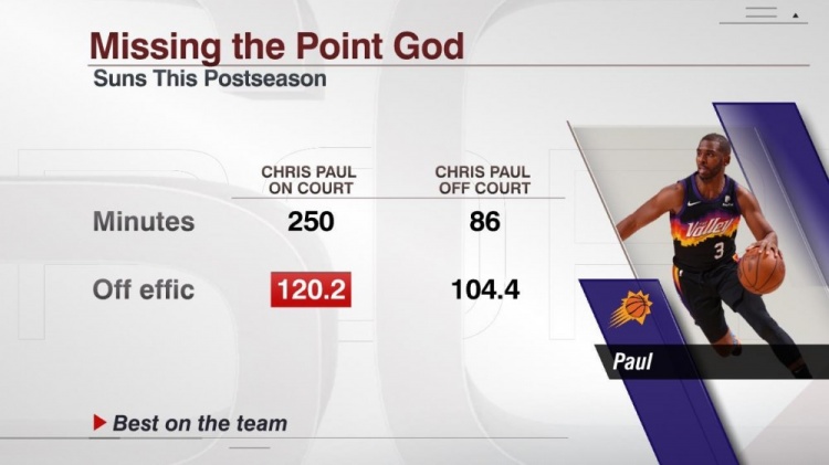 According to statistics, in the 250 minutes when Paul was present in this year’s playoffs, the solar attack efficiency (scoring every 100 rounds) was 120.2 (the best for the whole solar team);