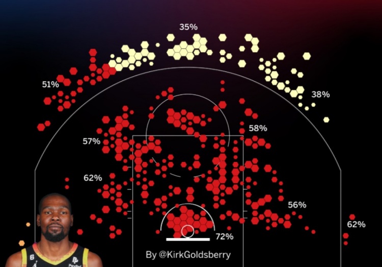 Durant cast the first 55%+40%+90% shooting season in NBA history in this season’s regular season, with no dead angle of horror efficiency.
