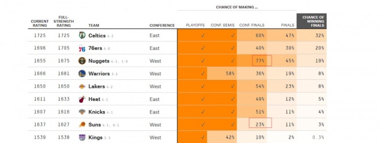 After the game, the big data agency FiveThirtyEight model predicted that the probability of gold nuggets promotion rose to 77 percent from 59 percent before, and the probability of Sun promotion was 23 percent.