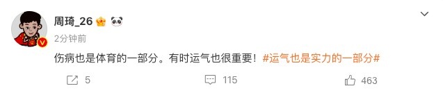 After the game, Zhou Qi updated his microblog and wrote: “Injuries are also part of sports. Sometimes luck is also important!# Luck is also a part of Strength#”