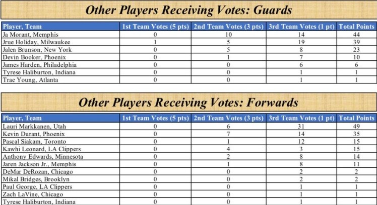 None of Sun was selected into the best lineup, among which Booker got one second-squad vote and seven third-squad votes, with a total score of 10; Durant got seven second-squad votes and 14 third-squad votes, the total score is 35.