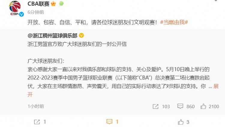 Just now, Zhejiang men’s basketball officially issued a statement calling on fans to watch the competition in a civilized way. CBA Official Bo forwarded an open letter sent by Zhejiang men’s basketball, with an accompanying article saying: “open, inclusive, confident and peaceful, please all fans and friends watch the match in a civilized way!”