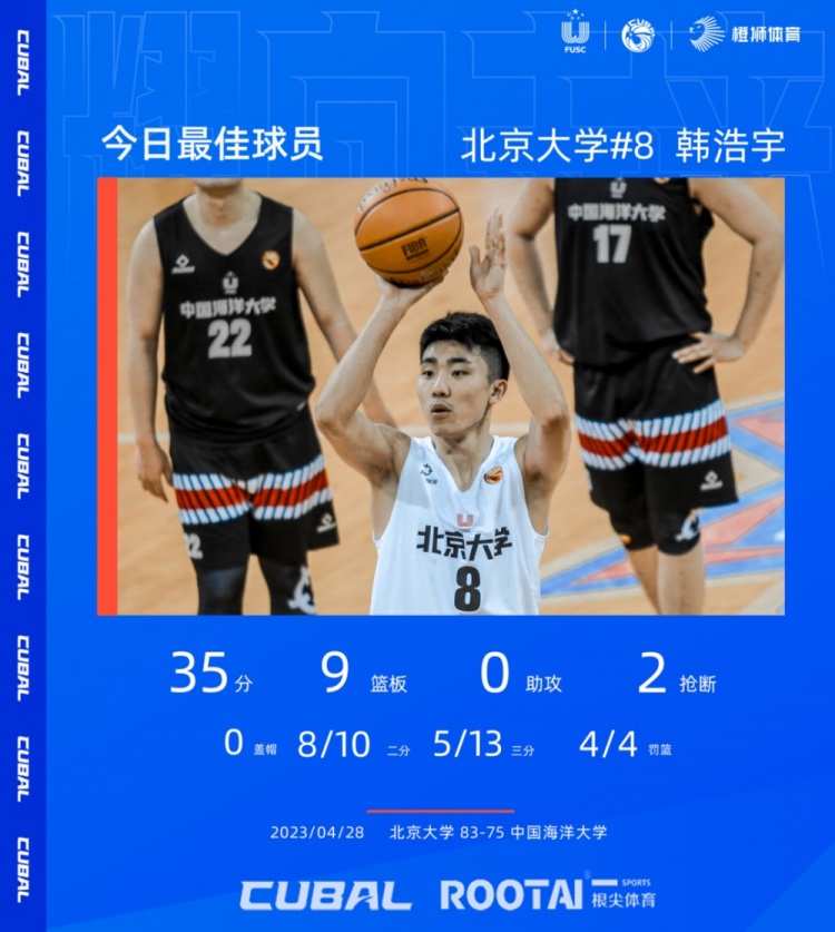 Today’s MVP gave Han Haoyu, No. 8, Peking University, 35 points and 9 rebounds in the battle with China Ocean University. As an important scorer in the team, it helped the team reverse the situation, finally win the game.