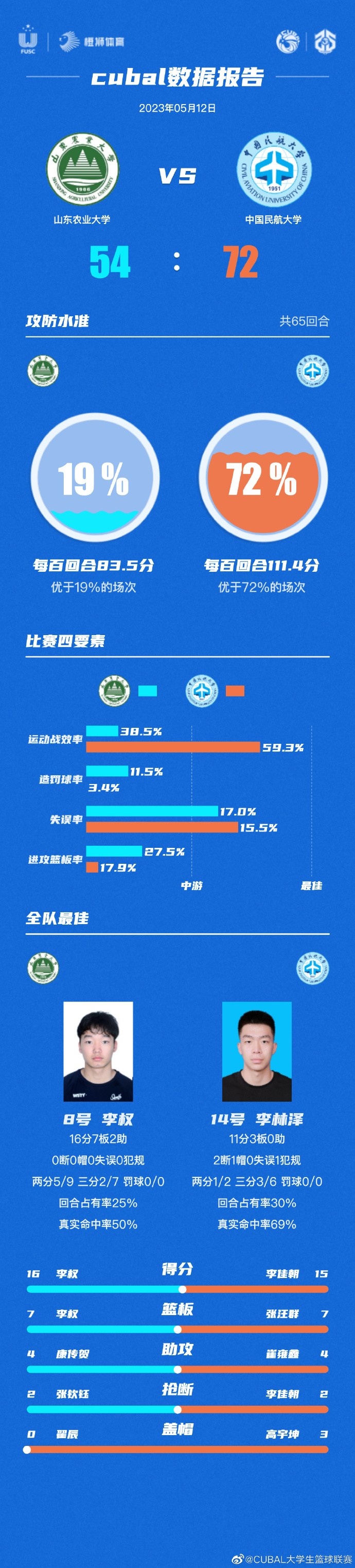 Shandong Agricultural University: Zhang Qinyu 15 points 5 Boards 2 help 2 break, Li Quan 16 points 7 Boards 2 help, Kang Chuanhe 8 points 5 boards 4 help