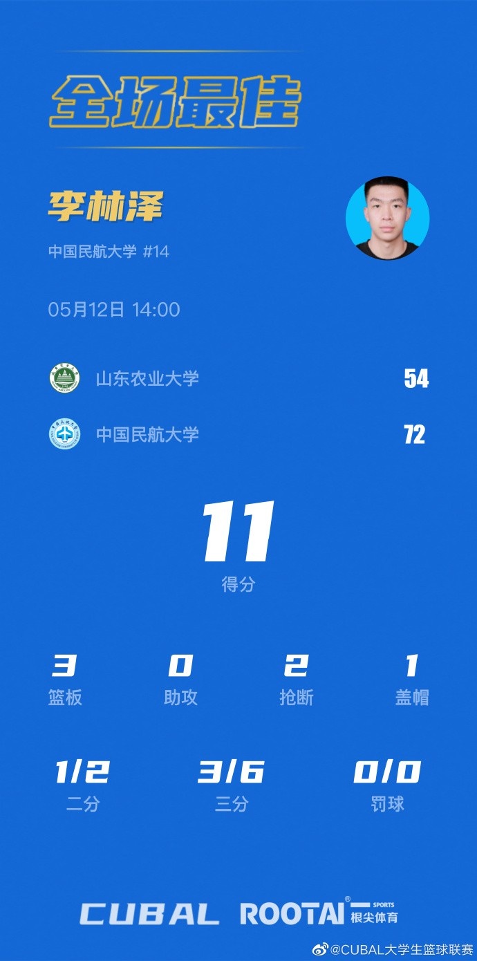 In the second half, the Civil Aviation of China came up with another three points, and the difference between them was more than 20 points. Although Li Quan continued to play well, the attack end of Shandong Agricultural University could not continue, gao Yukun also feels good and helps Civil Aviation of China firmly grasp the initiative in the competition. After the end of the three sessions, Civil Aviation of China 61-41 leads Shandong Agricultural University by 20 points. In the end, the hit rate of both sides declined. Zhang Qinyu had no choice but to score too much points one after another. Civil Aviation University of China could still hold a leading position of about 20 points. In the end, Civil Aviation of China defeated Shandong Agricultural University 72-54, promoted to the top 32 nationwide.