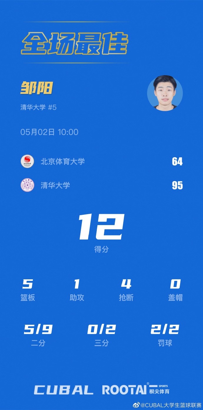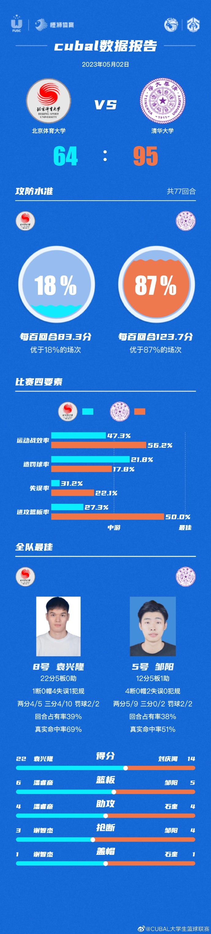 Tsinghua University: Zou Yang 12 points 5 boards 4 broken, Fang Jiachen 13 points 4 boards 3 help, Wen song 10 points 5 Boards 2 help, Liu Qingwen 14 points 3 boards, xu Xitong was 10 points, 3 boards were 3 broken, Zhou Ruiheng was 10 points and 2 boards, Yang Xihao was 8 points and 3 boards, Zhou Ziang was 5 points and 2 boards were 2 broken, Shi Kui was 6 points, 3 boards and 4 help, zhu Siyu 5 points 5 Boards 2 help