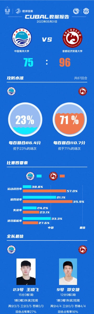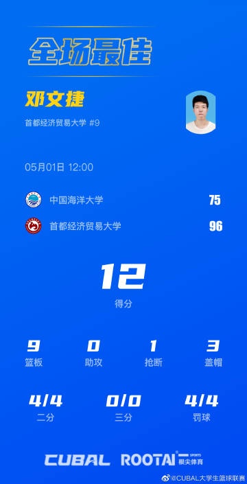 At the end of the quarter, azawa Xue Haihai went into the basket continuously, and the score difference expanded to 30 points. Hai da called out to suspend. After the suspension, Hai da three points felt powered on. Wang Xiaofei sent three points in succession, but he had no choice but to lose too many points in the early stage, it was hard to chase back. The game ended with a score of 75-96 and capital ecnomic and trade wins.