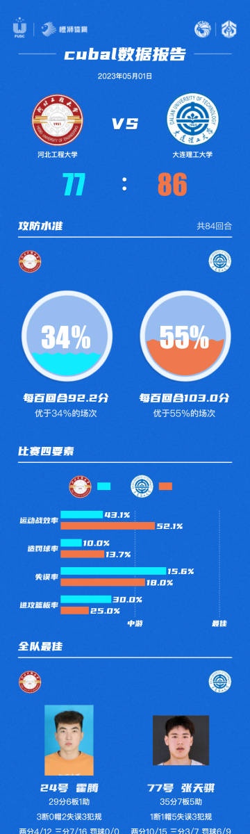 In the last quarter, Li Jiawei pulled his hands tightly to catch Wang Hongxiang to make up the basket, and the score was leveled again. The two sides once again entered the tug of war. Dalian Institute of Technology stood firmly and took the lead step by step through the competition of rebounding. Zhang Tianqi midfield oppressed the completion of snatching and layup into 2+1, and Dalian technology gained a leading edge again. Finally, the whole game ended with a score of 77-86. Dalian technology won the last ticket of the Northeast Eighth strong.