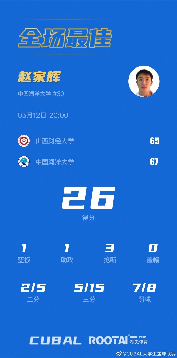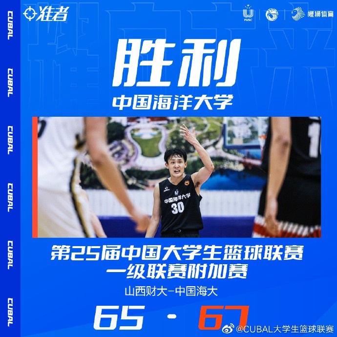 Yi Bian fought again. The two teams made mistakes in continuous iron strike, and the score was extremely difficult. China Haida always maintained a weak advantage. After three sections, China Haida led by 5 points 47-42. In the final decisive battle, the two teams were still difficult to distinguish, and the score was very firm. Zhang jinqianxiang used his personal ability to score points, and Zhao Jiafei sent a penalty to give a response, and the competition between the two sides fell into White Heat, at the critical moment, Zhao Jiangyan fought back successfully, and Liu Jiqi missed the opportunity of absolute peace by causing two penalties. In the end, China Haida 67-65 Li Ke Shanxi Finance University, promoted to the top 32 in the country.