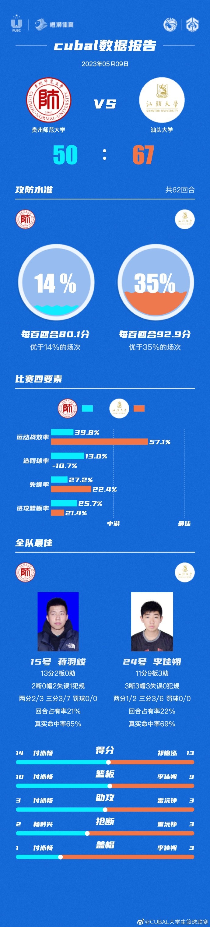 Shantou University: Qi Jinhong 13 points 3 Boards 2 broken, Li jiasuo 11 points 9 boards 3 Help 3 broken 3 caps, Wu Xuan 11 points 7 Boards 2 help 2 broken, Jian Zhongyuan 11 points 2 boards