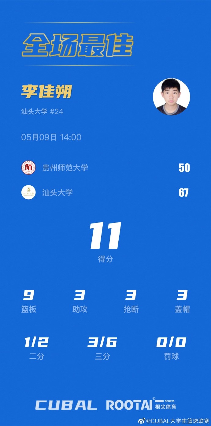 Live broadcast bar News on May 9th the national play-off of CUBAL College Basketball League officially kicked off. Group D matches Guizhou Normal University against Shantou University. The first of each group will be directly promoted to the top 32 in the country, the last place of the group will end the regret of leaving, and the second/third place of the group will compete for the final 4 national games through cross draw.