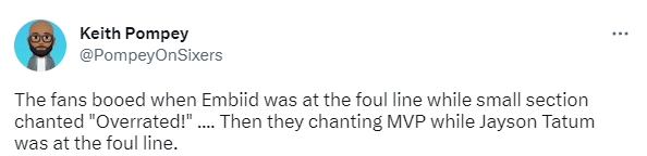 In this game, 76 people are the stars, and the new MVP enbide is coming back. In the first quarter, when he stood on freethrow line, Celtic home fans shouted, “Overrated!”