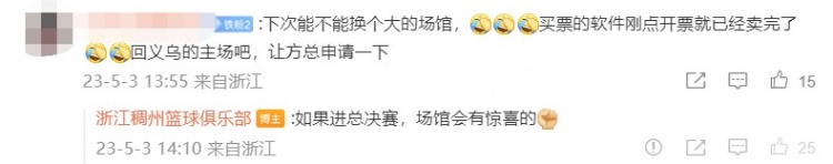 Today, Zhejiang Guobo released Events notice tomorrow night. Some fans wrote in the comment area: “Can you change to a big venue next time? The software for buying tickets has been sold out just after ordering the invoice, go back to Yiwu’s home court and ask General Fang to apply.”