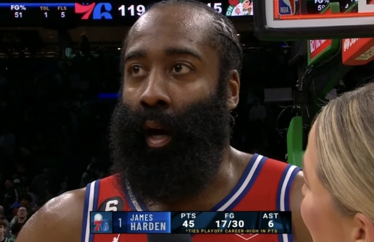 Live broadcast on May 2nd news NBA eastern semi-final G1,76 people away 119-115 like Green Army, the big score 1-0 leading. After the game, Harden was interviewed on the sidelines.