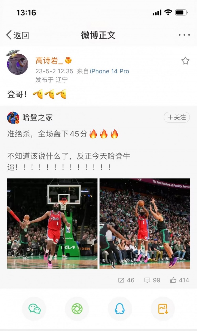 Shandong men’s basketball player Gao Shiyan forwarded the blog post of “Harden is awesome today” and wrote: “Brother Deng!”