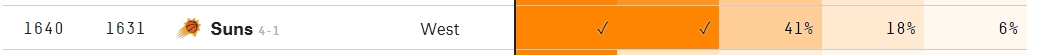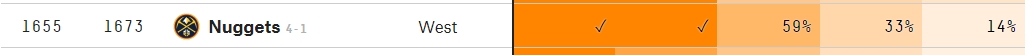The big data agency FiveThirtyEight model predicts that the probability of Nuggets promotion in this round is 59%, and the force pressure on the sun is 41%. The probability of gold nuggets winning the championship is 14% and the sun is 6%.